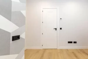 Las puertas son macizas lacadas en blanco nuclear, con burlete y picaporte magnético. Todas las puertas son abatibles y ciegas. Rodapié igual que las puertas en blanco.